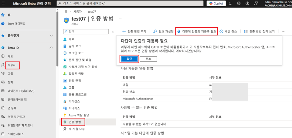 - 사용자 > 해당 사용자 선택 > 인증 방법 > 다단계 인증의 재등록 필요 > 확인 선택