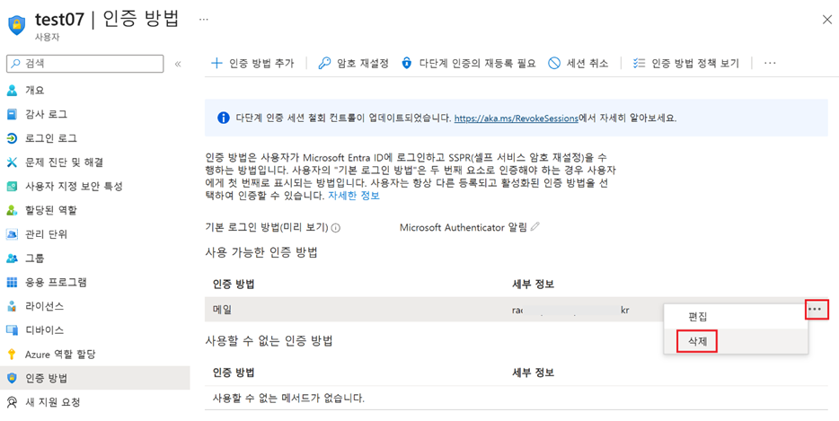 - 남아 있는 인증 방법이 있다면 ‘…’ 아이콘 선택 후 삭제 바랍니다.