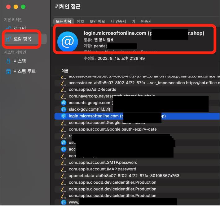Finder에서 이동 > 폴더로 이동 > 응용 프로그램 > 유틸리티 폴더로 이동 > 키체인 접근 도구 열기 > 암호 탭 선택 > 저장된 자격 증명 목록에서 항목을 오른쪽으로 선택하고 microsoft 관련 자격 증명을 선택하고 삭제